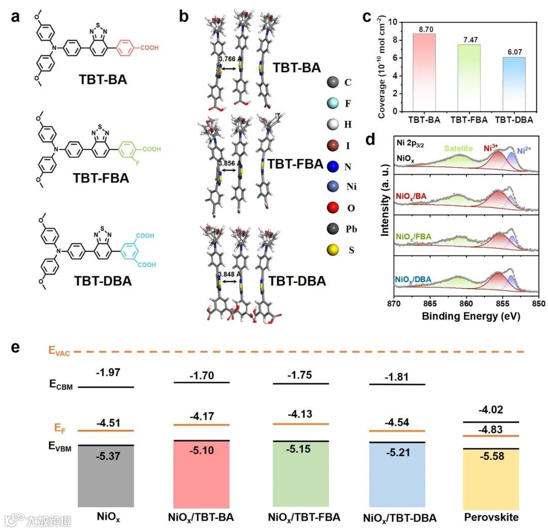 DFT计算表明TBT-BA具有最致密的分子间堆积,通过吸收也可以计算得到TBT-BA在NiOx上具有最高的表面覆盖率。NiOx/SAM/钙钛矿界面的能级排列表明,TBT-BA修饰后的NiOx具有最好的电子阻挡能力,但仅从能级上考虑TBT-BA修饰后的NiOx对于空穴提取并不是最有利的。
