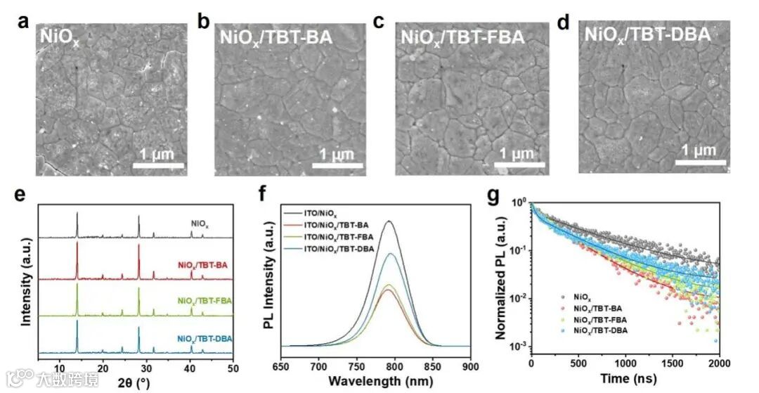 SEM和XRD表明,SAM修饰可以改善了钙钛矿埋底界面,使针孔减少,晶粒尺寸增大。PL和TRPL表明钙钛矿在NiOx/TBT-BA界面具有最有效的载流子提取。