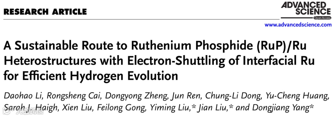 近日,青岛大学杨东江教授、内蒙古大学刘健教授、太原理工大学刘一鸣教授合作,在Advanced Science上发表题为“A Sustainable Route to Ruthenium Phosphide (RuP)/Ru Heterostructures with Electron-Shuttling of Interfacial Ru for Efficient Hydrogen Evolution”的研究论文。以海藻酸-Ru3+络合气凝胶为前体通过简单的热解和磷化工艺合成了负载在二维碳纳米片上的RuP/Ru异质结构(RuP/Ru@CNS)。研究表明,RuP/Ru异质结构中的界面效应导致的Ru原子电子结构变化。在RuP/Ru界面处,单质Ru部分电子转移到RuP中的Ru原子上,这种电子转移提升了单质Ru组分中Ru原子的H2O解离性能,并优化了RuP组分中Ru原子上的H*吸附。此外,在非酸性条件下,RuP/Ru界面上Ru原子之间的低H*溢出能垒促进了HER动力学。