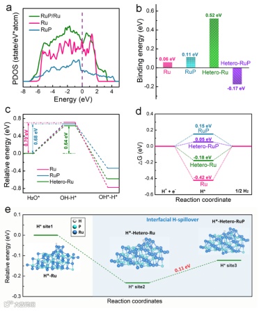 Figure 5. Theoretical calculations and analysis of the HER mechanism on the prepared electrocatalysts. (a) PDOS of the Ru, RuP, RuP/Ru models. (b) The binding energy of H2O with Ru atoms on Ru and RuP surfaces and at the RuP/Ru interface. (c) The calculated kinetic barrier of H2O dissociation on Ru atoms in Ru, RuP and Hetero-Ru. (d) The calculated hydrogen adsorption free energy diagram for Ru atoms in Ru, RuP/Ru and RuP. (e) The calculated hydrogen spillover energy barrier between Ru atoms at the RuP/Ru interface.