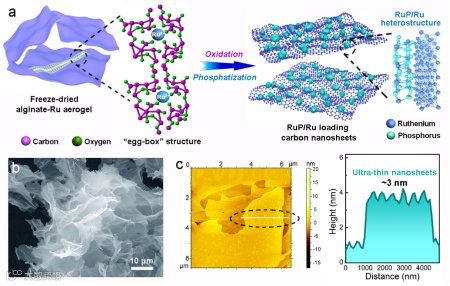 要点一:海藻酸盐是一种从褐藻中提取的可再生天然生物多糖,其α-l-gulurate (G)嵌段可与多价金属离子(如Co2+、Ni2+、Fe3+、Ru3+等)自发络合形成“蛋盒”结构,通过热解可以实现金属化合物(氧、硫、磷化物)微纳结构的可控制备。通过对海藻酸-Ru3+水凝胶快速冷冻,在冰模板的作用下,通过冷冻干燥、热解和磷化工艺,获得超薄(厚度3-5 nm)的RuP/Ru@CNS催化剂,其负载的RuP/Ru纳米颗粒尺寸大约2-4 nm。