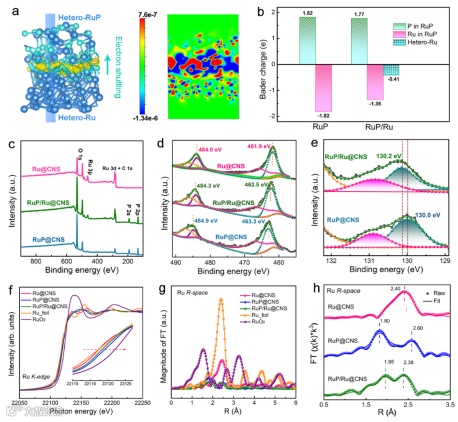 Figure 3. Electronic and structural characterization of the prepared electrocatalysts. (a) The calculated charge density of the RuP/Ru interface. (b) Bader charge analysis diagram of RuP and the RuP/Ru heterostructure. (c) XPS full survey spectra and (d) high-resolution XPS spectra of Ru 3p for Ru@CNS, RuP/Ru@CNS and RuP@CNS. (e) High-resolution P 2p XPS spectra of RuP/Ru@CNS and RuP@CNS. Ru K-edge (f) XANES and (g) the FT-EXAFS and (h) best-fit EXAFS spectra in R space for Ru@CNS, RuP@CNS and RuP/Ru@CNS.