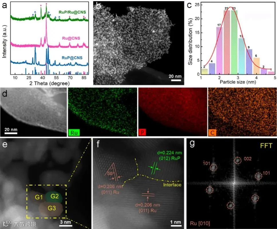 Figure 2. Structural characterization of the prepared electrocatalysts. (a) XRD patterns of RuP/Ru@CNS, Ru@CNS and RuP@CNS. (b) HAADF-STEM image and (c) diameter distribution of RuP/Ru nanoparticles in RuP/Ru@CNS. (d) HAADF-STEM image and corresponding EDS elemental maps of Ru, P and C in RuP/Ru@CNS. (e), (f) High-resolution HAADF-STEM images of RuP/Ru@CNS and (g) corresponding FFT of nanoparticle G1 in (e).