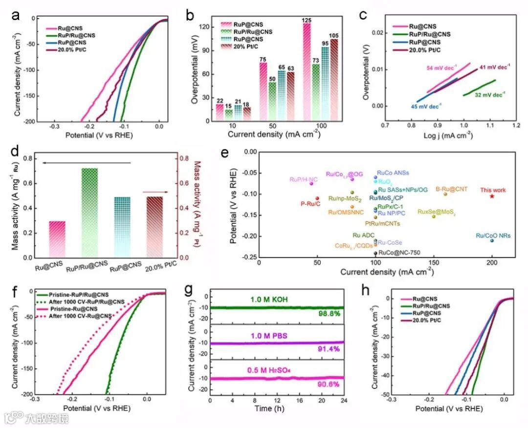 Figure 4. Electrocatalytic HER performance of the prepared electrocatalysts. (a) IR-corrected HER LSV curves, (b) overpotential values of Ru@CNS, RuP/Ru@CNS RuP@CNS and 20% Pt/C at j=10, 50 and 100 mA·cm−2, respectively, in 1.0 M KOH electrolyte, (c) Tafel plots and (d) mass activity of RuP/Ru@CNS, RuP/Ru@CNS, RuP@CNS and 20.0% Pt/C in 1.0 M KOH. (e) Comparison of overpotentials at 10 mA·cm−2 and the Tafel slope of RuP/Ru@CNS with previously reported Ru-based electrocatalysts in alkaline media. (f) Cycling stability of RuP/Ru@CNS and Ru@CNS in 1.0 M KOH electrolyte. (g) The time dependence of current density curves at static overpotentials at 10 mA·cm−2 for 24h in 1.0 M KOH, 1.0 M PBS and 0.5 M H2SO4 electrolytes. (h) IR-corrected HER LSV curves for Ru@CNS, RuP/Ru@CNS, RuP@CNS and 20% Pt/C in a 1.0 M PBS electrolyte.