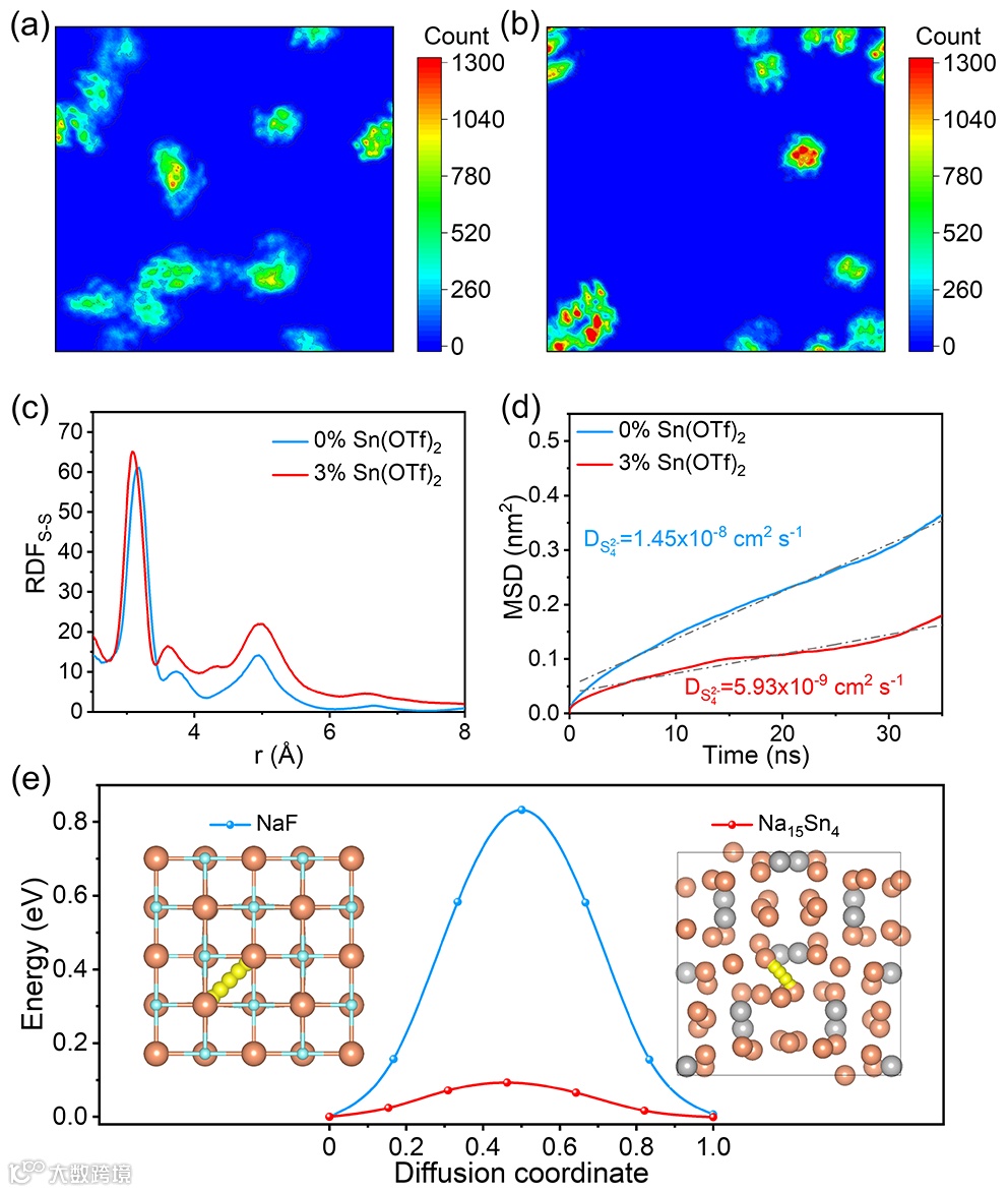 分子动力学结果证明,S42-阴离子能够均匀分布在基础电解液(1M NaTFSI-TEP-FEC)中。然而,在引入Sn(OTf)2的电解液中,Sn2+阳离子与S42-阴离子相互作用导致S42-以准固体团簇的形式存在,而不是以溶剂分离的离子对结构存在。与基础电解液相比,引入Sn(OTf)2添加剂的电解液显著降低了多硫化钠(NaPSs)溶解度和扩散速率,从而抑制了NaPSs的穿梭效应。