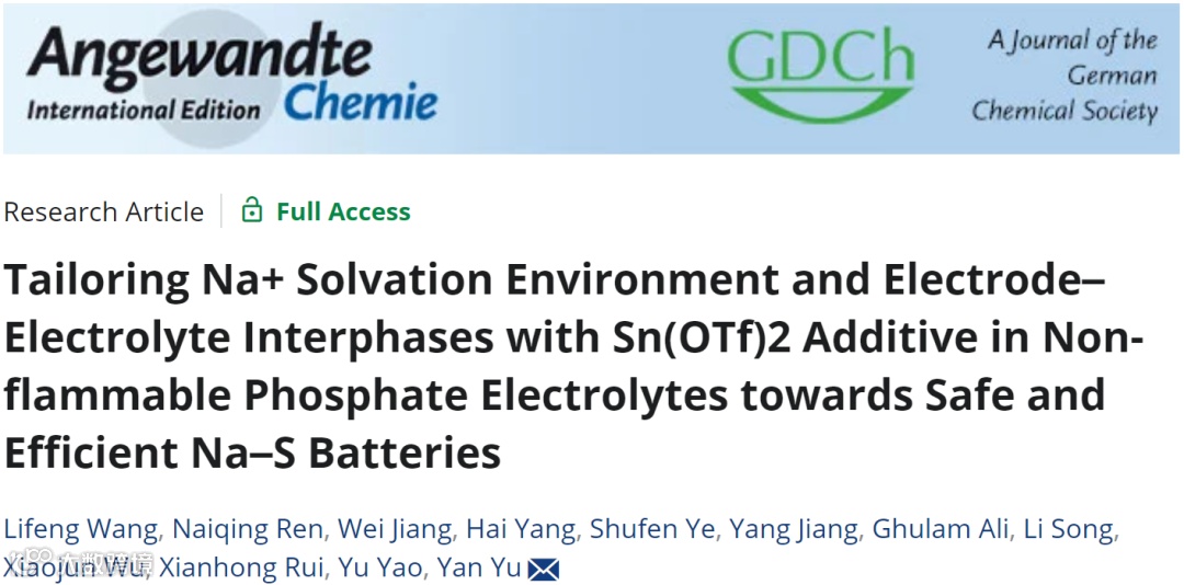 近日,中国科学技术大学余彦教授团队在国际知名期刊Angewandte Chemie上发表题为“Tailoring Na+ Solvation Environment and Electrode–Electrolyte Interphases with Sn(OTf)2 Additive in Non-flammable Phosphate Electrolytes towards Safe and Efficient Na–S Batteries”的文章。该工作通过在磷酸酯基电解液(1M NaTFSI-TEP-FEC)中引入三氟甲磺酸锡(Sn(OTf)2)添加剂,有效调节并改善了Na+溶剂化环境和电极-电解液界面化学性质,进而提高了RT Na-S电池的循环稳定性。