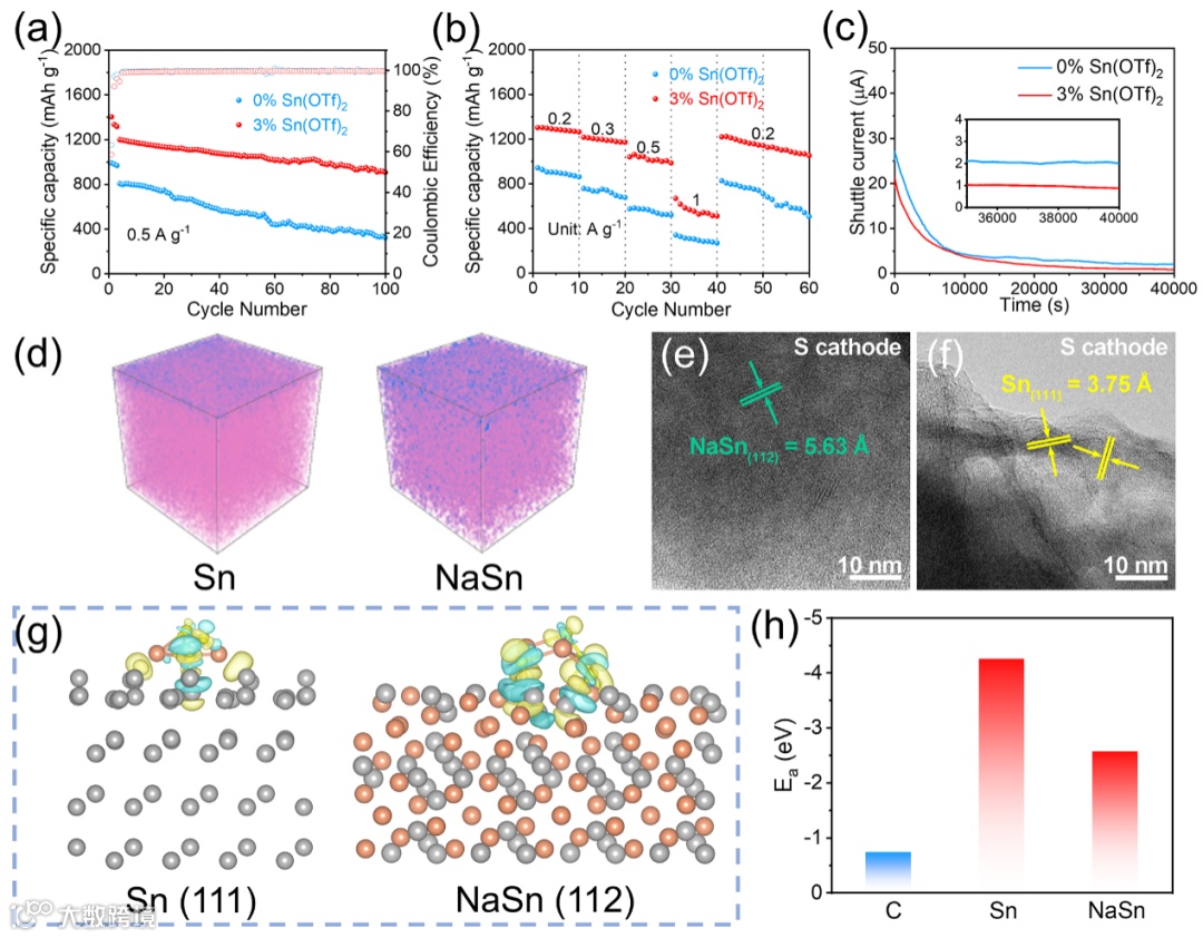 要点四:Sn(OTf)2添加剂诱导硫正极形成富含Sn和NaSn合金的CEI膜,抑制多硫化物的穿梭