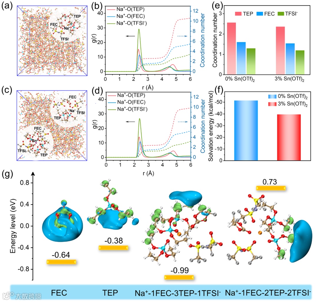 理论计算结果表明,引入Sn(OTf)2添加剂后,电解液的主要溶剂化结构由Na+-1FEC-3TEP-1TFSI变为Na+-1FEC-2TEP-2TFSI-,有利于降低Na+去溶剂化能垒。此外,Na+-1FEC-2TEP-2TFSI-具有更高的LUMO能级(0.73 eV),能够促进游离的氟代碳酸乙烯酯(FEC)优先分解形成稳定的固体电解质膜(SEI),进而抑制磷酸三乙酯(TEP)的分解,增强电解液的稳定性和对钠兼容性。