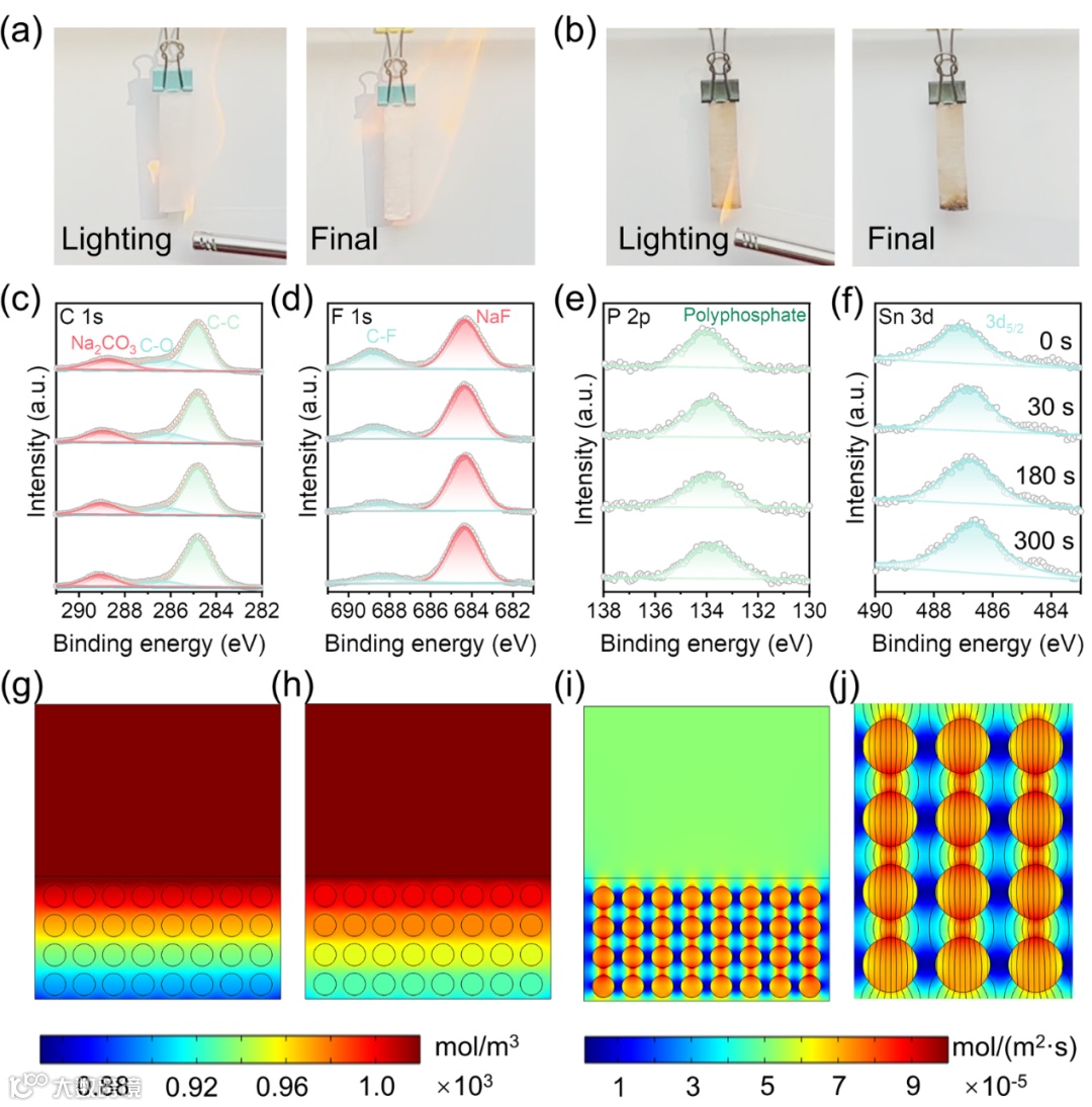 电解液点火实验证实了所设计的含Sn(OTf)2添加剂的磷酸酯基电解液具有良好的阻燃特性。XPS和HRTEM进一步证明Sn(OTf)2添加剂的引入能够诱导钠负极表面形成富含Na15Sn4的SEI。有限元模拟揭示了富含Na15Sn4的SEI具有更快的Na+扩散动力学和更大的Na+扩散通量,可以有效缓解钠负极表面的Na+耗竭现象,抑制钠枝晶的生长,促进均匀致密的钠沉积行为。