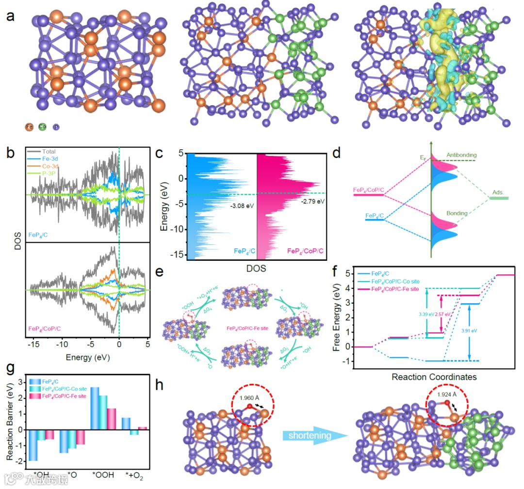 为了进一步验证异质结构对正电荷位点以及铁氧化态的影响,构建了FeP4/CoP模型,从理论角度计算异质结对界面电荷和OER催化性能的影响。从差分电荷密度图可以看到电荷的差异性分布,验证了在Fe侧有更多的正电荷位点,增强了其对OH-的吸附;其次异质结界面作用能够影响d带中心的位置,增强了反应中间体的吸附能;另外Gibbs自由能计算结果表明在形成异质结后,明显降低了速率控制步骤*OOH形成的反应能垒。
