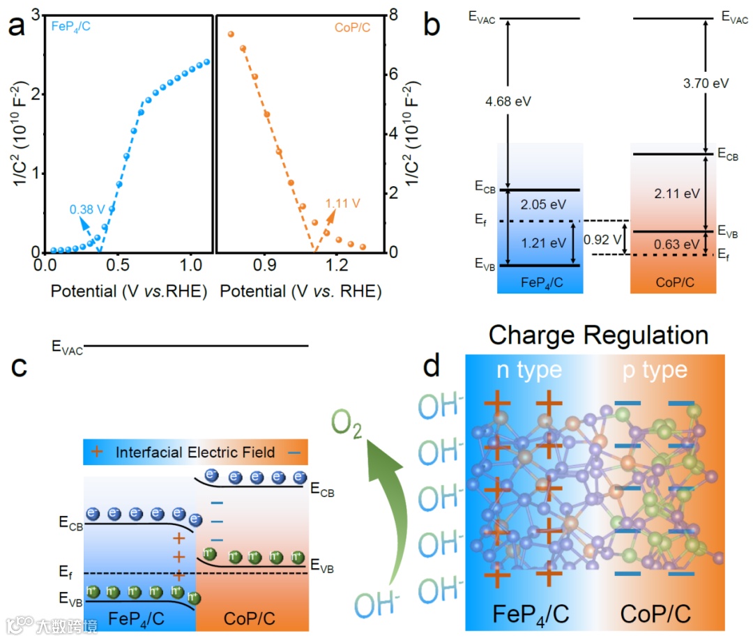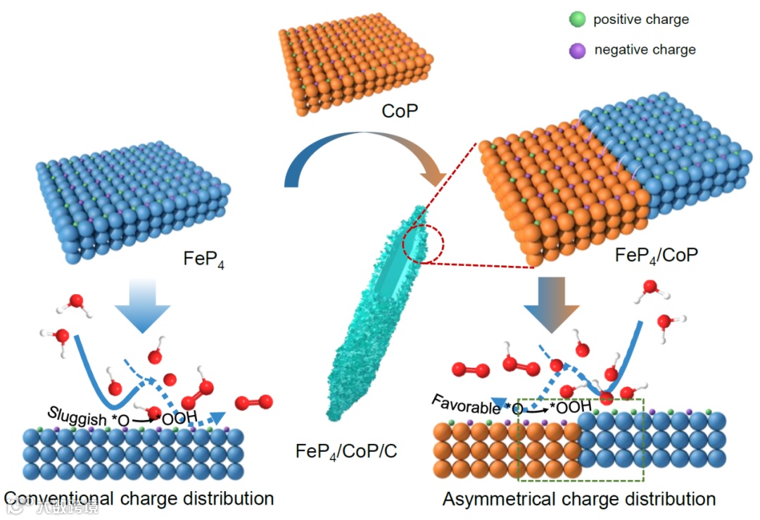 图1. FeP4/CoP/C p-n异质结催化剂OER性能增强机理示意图