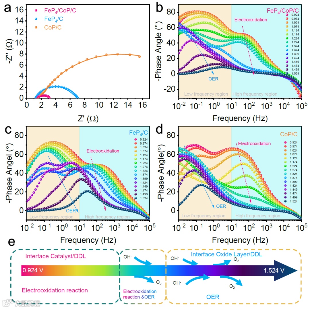 在电催化OER过程中,催化剂会随着电位的变化持续形成不同的反应界面。通过分析在不同电位下的相位图可以获得催化剂与电解液反应界面之间的信息,以判断其电化学反应行为。如图3所示,在高频区对应着催化剂电化学氧化的过程,随着电位逐渐升高,催化剂原位氧化完成,开始进行OER过程。对电化学氧化完成和OER起始电位的判断,可以判断OER性能的差异。从图可以判断,p-n异质结催化剂具有较低的电化学氧化完成电位,即能够加速催化剂的电化学氧化过程从而加速OER过程,降低OER电位。