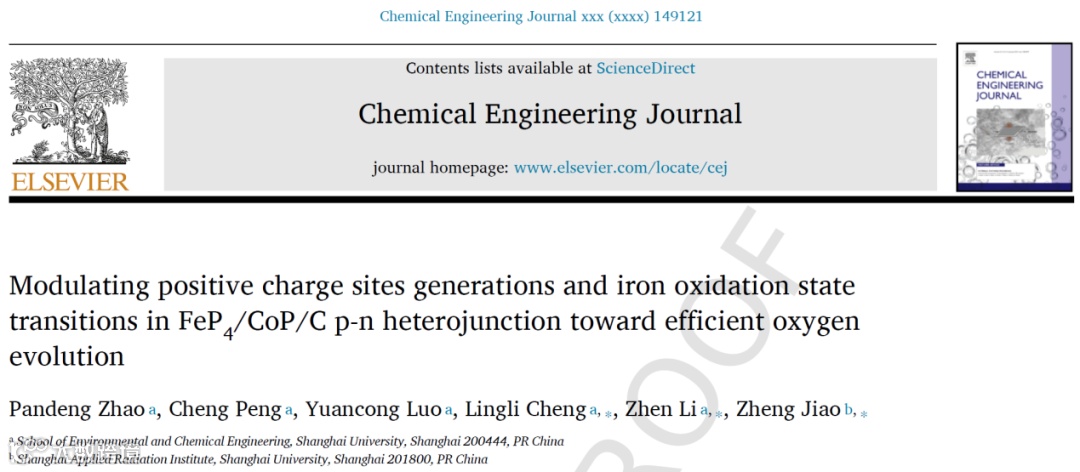 近日,上海大学环境功能材料课题组焦正教授团队在国际知名期刊Chemical Engineering Journal 上发表题为“Modulating positive charge sites generations and iron oxidation state transitions in FeP4/CoP/C p-n heterojunction toward efficient oxygen evolution”的研究文章。该文章通过离子交换与热处理方法制备得到中空结构的FeP4/CoP/C p-n 异质结,并把能带结构理论与OER催化机理相结合,从实验与理论计算两方面共同分析了异质结中正电荷活性位点产生和铁氧化态转变对OER性能提升的机理。文章中异质结催化剂的研究对设计与制备高性能的OER催化剂具有深远的参考价值。