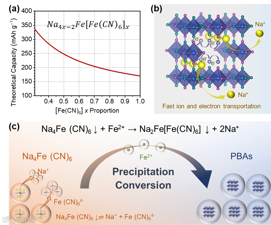 图1. (a)[Fe(CN)6]空位对普鲁士蓝比容量的影响;(b)[Fe(CN)6]空位对普鲁士蓝电化学性能的影响;(c)沉淀转化合成普鲁士蓝的机理。图片来源:Angewandte Chemie - International Edition.