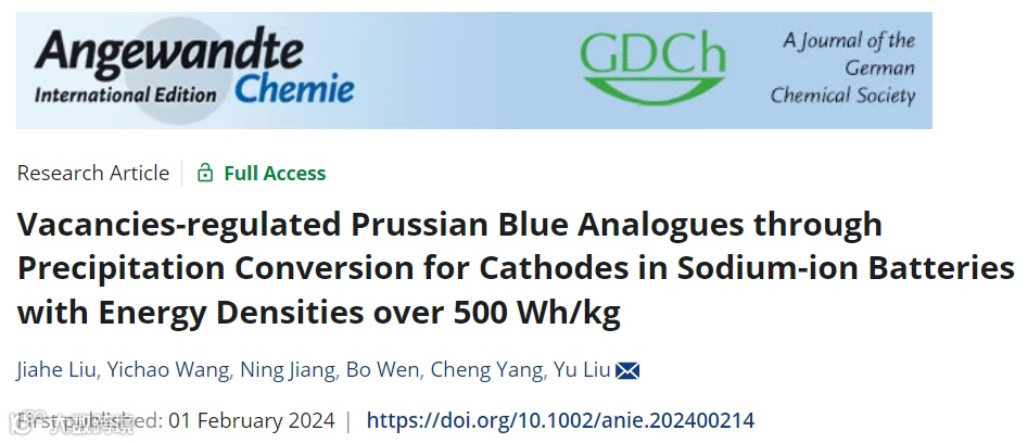 近日,来自中国科学院上海硅酸盐研究所的杨程副研究员和刘宇研究员,在国际知名期刊Angewandte Chemie - International Edition上发表题为“Vacancies-regulated Prussian Blue Analogues through Precipitation Conversion for Cathodes in Sodium-ion Batteries with Energy Densities over 500 Wh/kg”的研究文章。该文章在此,我们提出[Fe(CN)6]空位是实现高比容量普鲁士蓝的关键。另外,[Fe(CN)6]空位还可能产生净电子并减少离子传输的障碍,这会增加其电子和离子电导,从而在一定程度上有助于提升普鲁士蓝的倍率性能。