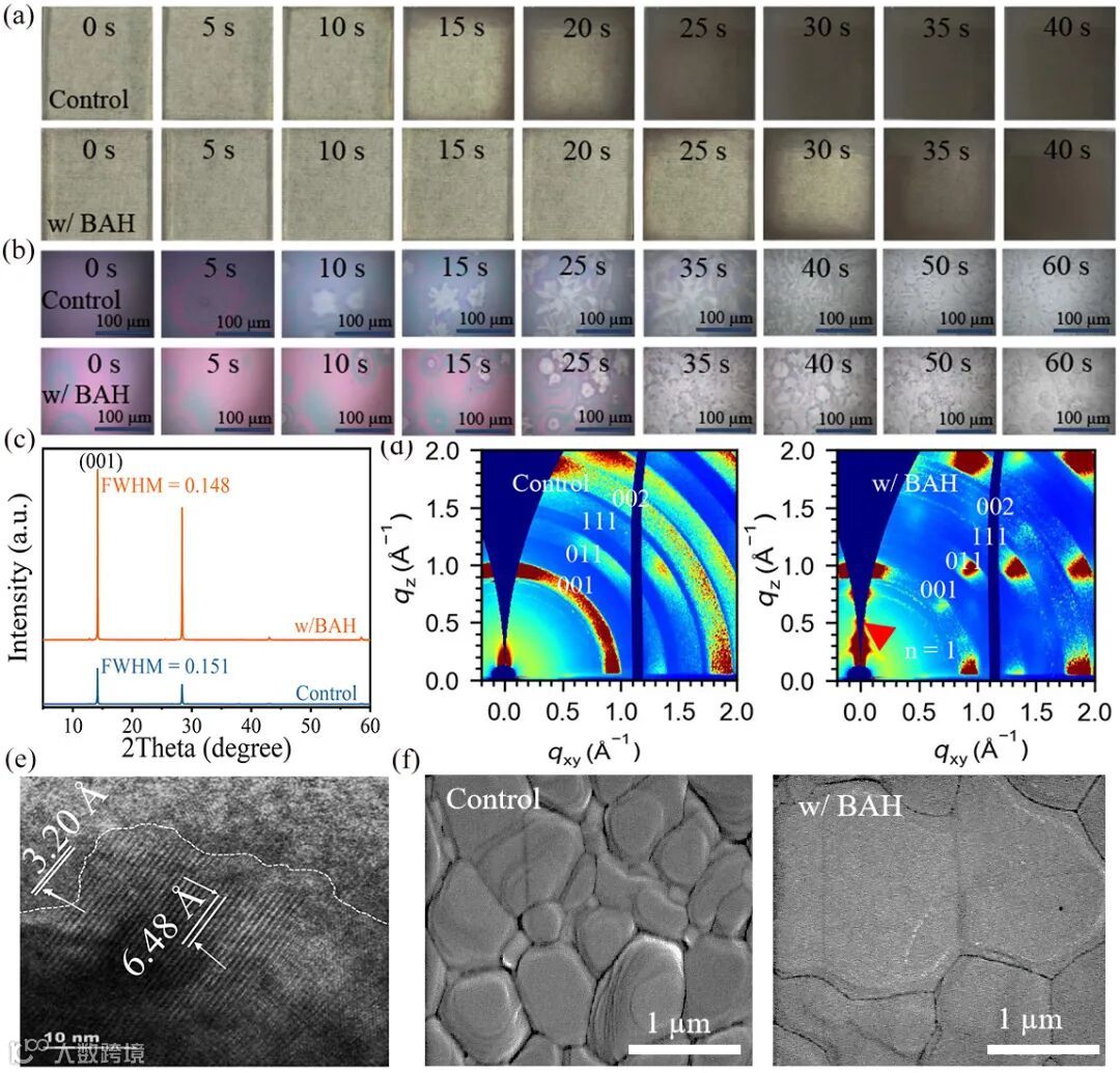 Figure 2. a) Photographs of the precursor perovskite film after annealing for different times. b) Images of the nucleation and crystal growth process of control and BAH-treated perovskite films under a fluorescent microscope. c) The XRD patterns and d) GIWAXS images of control and BAH-treated perovskite films. e) TEM image of BAH-treated perovskite crystal. f) Top-view SEM images of control and BAH-treated perovskite films.