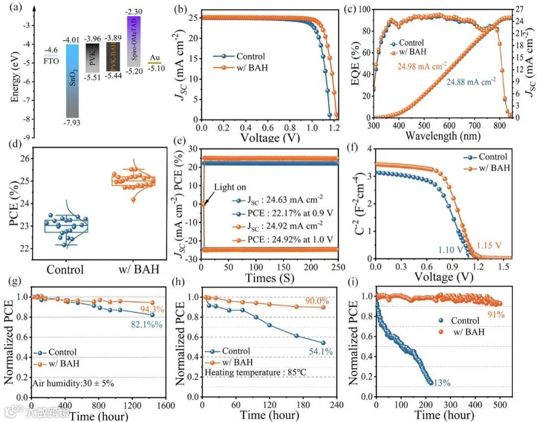 Figure 6. a) The energy-level diagram of the perovskite device. b) The J-V and c) EQE curves of control and BAH-treated PSCs. d) The statistical box charts of PCE, e) stabilized power output and f) Mott–Schottky plots of control and BAH-treated PSCs. The control and BAH-treated PSCs ageing g) in air with RH of 30 ± 5% and h) at 85 °C in nitrogen. i) The MPP tracking of encapsulated control and BAH-treated PSCs under continuous light illumination (100 mW cm-2) with RH 30 ± 5% for 500 h.