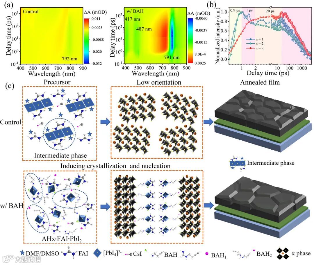 Figure 3. a) The TA spectra of control and BAH-treated films and b) the carrier-transfer dynamics in BAH-treated film. c) Schematic diagram of the nucleation and crystallization for control and BAH-treated perovskite films.