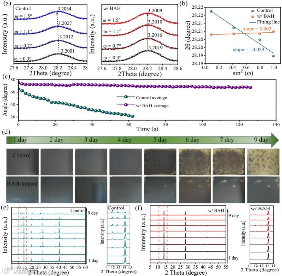 Figure 4. a) GIXRD spectra of control and BAH-treated perovskite films at different slant angles, and b) linear fit of 2θ-sin2φ for the control and BAH-treated perovskite films. c) The water contact angles of control and BAH-treated perovskite films at different times. d) Photographs of control and BAH-treated perovskite films ageing in air with RH of 85% and corresponding XRD patterns for e) control and f) BAH-treated perovskite films.