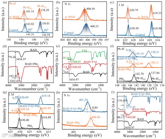 Figure 1. The XPS spectra of control and BAH-treated perovskite films: a) Pb 4f, b) N 1s and c) I 3d. The FTIR spectra of d) BAH and BAH + PbI2films, and e) FAI, BAH + FAI, and BAH films. The XPS spectra for PbI2, BAH + PbI2 and BAH + FAI + PbI2films: f) Pb 4f and g) I 3d. h) The XPS spectra of N 1s for BAH + PbI2and BAH + FAI + PbI2films. i) The FTIR spectra of BAH, BAH + PbI2and BAH + FAI + PbI2films.