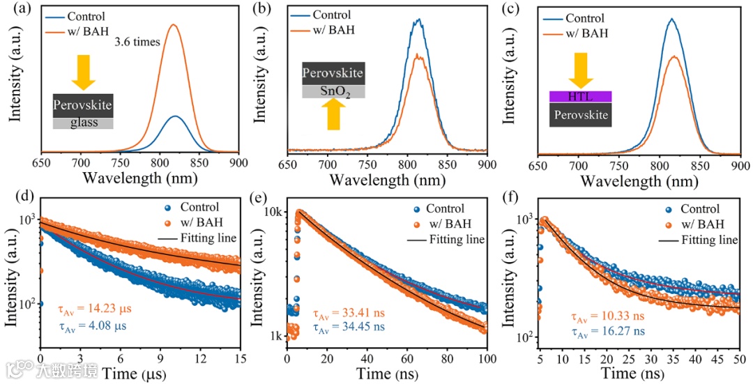 Figure 5. a) The steady-state PL and d) TRPL spectra of control and BAH-treated perovskite films on glass substrate. b) The steady-state PL and e) TRPL spectra of control and BAH-treated perovskite films on FTO/SnO2 substrate. c) The steady-state PL and f) TRPL spectra of control and BAH-treated perovskite films with Spiro-OMeTAD spin-coated on the incident side.