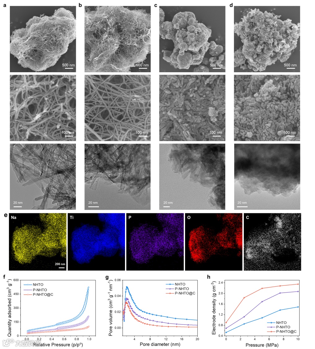 通过扫描电镜和透射电子显微镜观察,发现磷酸盐促进了钛酸钠纳米管的微观结构重塑,400°C即可实现从高表面能的纳米管转变为低表面能的棒状纳米颗粒,并形成致密的聚集体(P-NHTO)。亲水碳黑的引入进一步降低了表面积和孔隙率(P-NHTO@C),提高了电极致密度。最终,磷酸盐和亲水碳黑协同作用,使电极压实密度达到 2.35 g cm-3,接近块体电极材料水平。