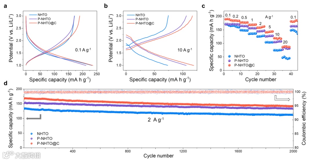 致密化后的电极 (P-NHTO 和 P-NHTO@C) 具有略微更高的电位,表明磷酸基团掺入钛酸钠材料结构中,产生了P-O-Ti诱导效应。所有电极在高倍率充放电 (10 A g−1) 下均表现出优异的容量保持能力,其中P-NHTO@C 尤为突出,表明致密化之后性能不仅没有下降,反而得到提升。P-NHTO@C 电极在 2 A g−1 的电流密度下循环 2000 次后仍保持 142.7 mA h g−1 的容量。