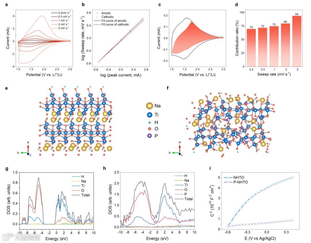 通过循环伏安测试 (CV) 和恒电流间歇滴定法 (GITT) 对比研究了致密化电极的锂存储动力学。结果表明,磷酸盐致密化保持了电极的赝电容特性,电极的电容贡献高达 85%,锂离子存储主要通过快速表面反应而非缓慢的固态扩散进行,解释了其优异的速率性能。DFT 计算和 Mott-Schottky 分析揭示了磷酸盐改性增加了材料的无序度,提高了电子密度和载流子浓度,增强了电子导电性,有助于电化学反应的电荷转移。这些因素共同促成了 P-NHTO@C 电极的优异性能,使其成为高性能锂电池负极材料。