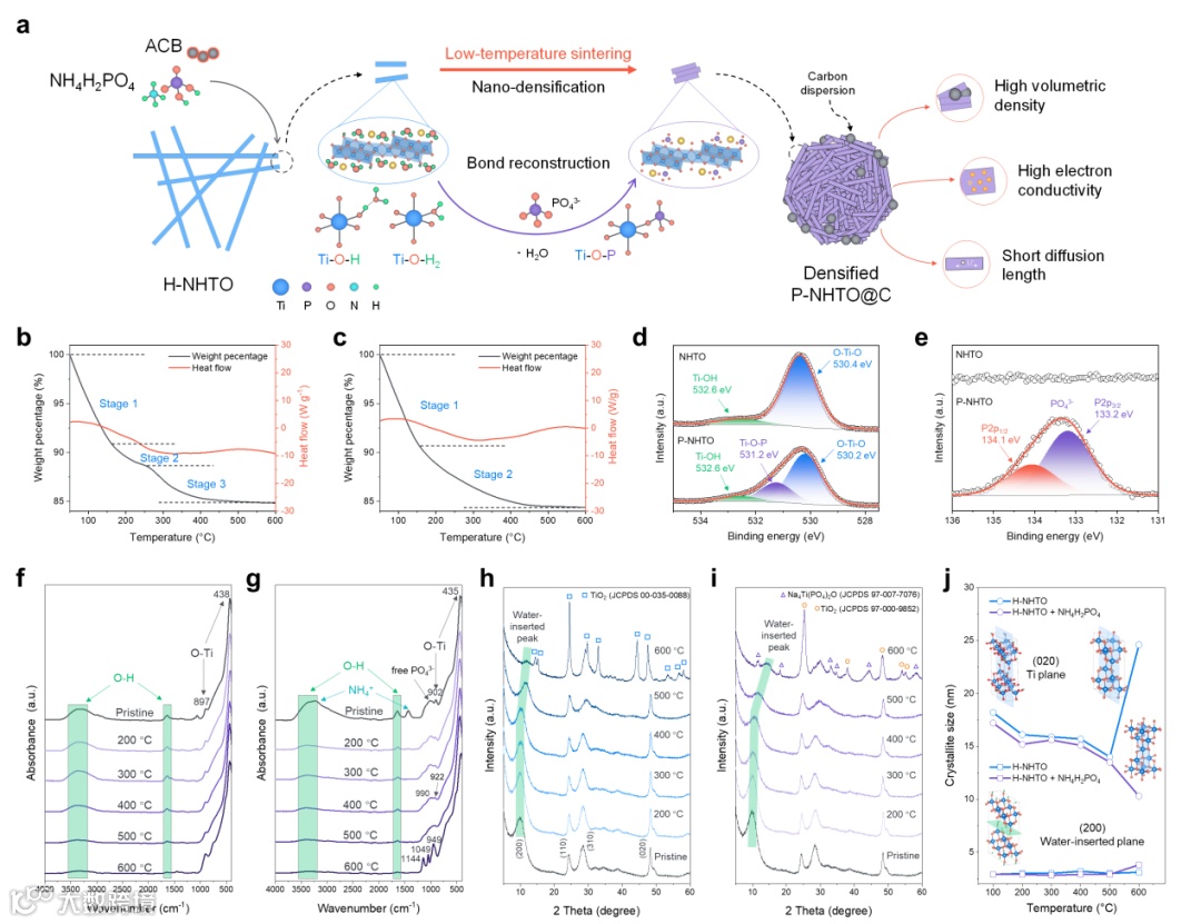 水合层状钛氧化物A₂TiₙO₂ₙ+1·nH₂O (A = H, Li, Na, K) 材料,因其在锂离子电池和其他金属离子电池中的应用潜力而受到广泛研究。它们的一个重要优势是锂嵌入电压高于 1.0 V,提高了电池安全性。此外,无锂钛氧化物的使用充分利用了丰富的廉价资源,降低了成本。然而,这些纳米钛氧化物的致密化却并不容易实现,因为它们结晶水的解离需要600 °C左右的热处理,伴随着严重晶粒生长以及相变,大大降低其电化学性能。本研究引入磷酸盐助剂 NH4H2PO4,利用热重-差热联用技术、XPS、FT-IR、XRD 等手段揭示了其促进钛酸钠水合物NaHTi3O7·2H2O (H-NHTO) 化学与结构演化机制。结果表明,磷酸盐与钛酸钠水合物相互作用,形成更强的 Ti-O-P 骨架,降低脱水能耗,大大促进了结晶水的解离,有助于实现低温烧结。