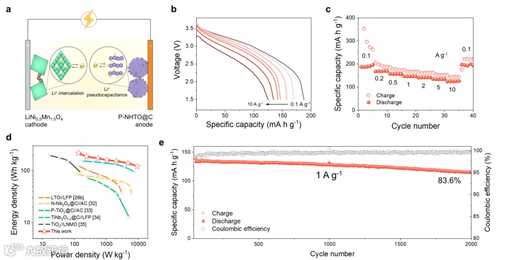 进一步将高密度赝电容负极 P-NHTO@C与高电压 LiNi0.5Mn1.5O4(LNMO) 正极组装全电池验证其器件性能。该全电池无需预锂化或锂补偿剂即可正常工作。与其他先进储能器材相比,P-NHTO@C//LNMO 全电池能量密度和功率密度表现优异,在 134.3 W kg-1 的功率密度下达到 220.2 W h kg-1 的能量密度。此外,电池还展现了快速的放电性能,在 47.9 秒内达到 121.8 W h kg-1 的能量密度和 9.4 kW kg-1 的功率密度。电池循环稳定性同样出色,2000 次循环后仍保持 83.6% 的容量,平均库仑效率高达 99.2%。
