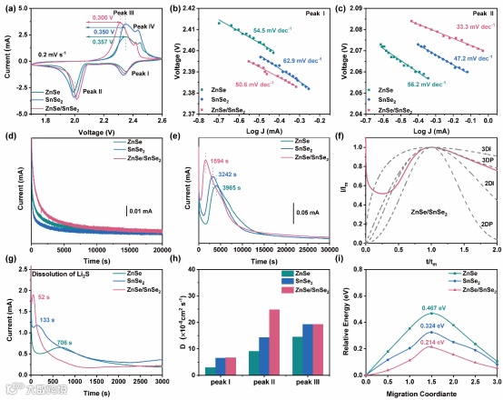 图3. (a) CV曲线;(b-c) Tafel图分别对应S8还原为Li2Sn和Li2Sn还原为Li2S;(d)Li2S8恒电位放电至2.2 V时的i-t图;(e)Li2S4恒电位放电至2.0 V时的i-t图;(f)与理论模型比较ZnSe/SnSe2相应的无量纲瞬态曲线;(g)恒电位充电至2.35 V时i-t图;(h) DLi+值;(i)锂离子迁移过程的能量势垒分布曲线。
