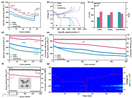 图6. ZnSe、SnSe2和ZnSe/SnSe2修饰PP隔膜组装电池的测试结果。(a) 0.2 C-4 C时的倍率性能;(b) 0.5 C对应的GCD曲线;(c)从放电-充电曲线得到的ΔE和Q2/Q1值;(d-e) 0.5 C和2 C时的循环性能。(f) ZnSe/SnSe2隔膜组装的Li-S电池循环曲线。(g) ZnSe/SnSe2隔膜组装的电池在0.5 C下充放电过程中的原位拉曼光谱。