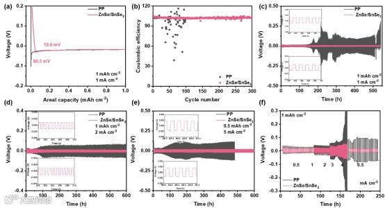 团队采用库仑效率(CE)和循环测试,进一步验证了ZnSe/SnSe2在诱导锂沉积方面的增强作用。如图4所示,与未修饰PP隔膜电池相比,采用ZnSe/SnSe2隔膜组装的电池表现出接近100%的CE和更低的初始过电位;经过500 h后仍保持光滑的曲线平台。这些结果表明,ZnSe/SnSe2具有优异的亲锂性,有效地降低了局部电流密度,从而实现了均匀的锂成核沉积。