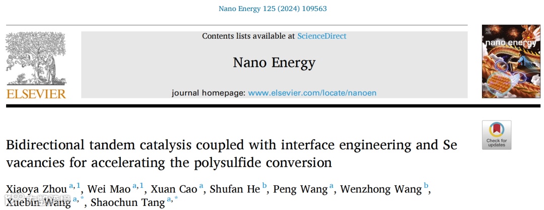 Xiaoya Zhou#, Wei Mao#, Xuan Cao, Shufan He, Peng Wang, Wenzhong Wang, Xuebin Wang*, Shaochun Tang*. Bidirectional Tandem Catalysis Coupled with Interface Engineering and Se Vacancies for Accelerating the Polysulfide Conversion, Nano Energy, 2024, 125, 09563,