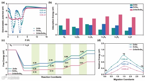 图5. (a) ZnSe和SnSe2静电势和功函数分布;(b)硫吸附能;(c) ZnSe、SnSe2和ZnSe/SnSe2上S8还原为Li2S的相对自由能;(d) Li2S分解势垒的能量分布图。