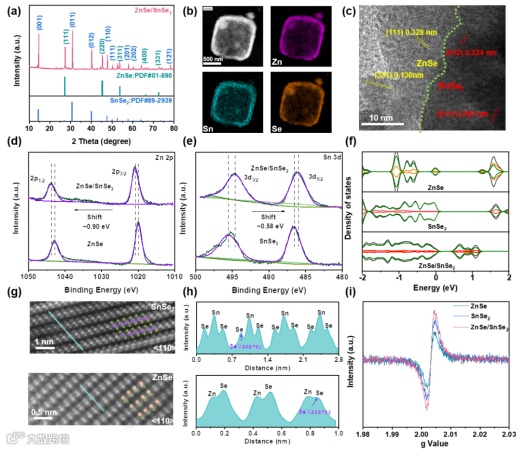 图2. (a) ZnSe/SnSe2的XRD图谱;(b) HAADF-STEM图像及相应的EDS元素分步图;(c) HRTEM图;(d) Zn 2p和(e) Sn 3d的高分辨XPS图谱;(f)计算得到的ZnSe、SnSe2和ZnSe/SnSe2的DOS;(g) AC-HADDF-STEM图;(h)从(g)中的蓝线获取的线扫描强度分布图;(i) EPR曲线。