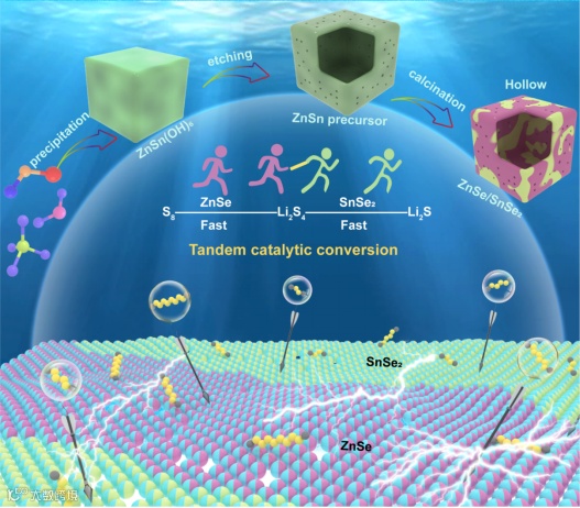 针对以上问题,亟需开发一种能够提供多活性位点、高比表面积和大量离子扩散路径/传输通道的极性催化剂。本研究提出一种双向串联催化策略,并设计制备出新型的中空纳米结构双金属硒化物(ZnSe/SnSe2),其拥有两种催化活性中心、非均相界面和大量的硒空位。中空结构对多硫化物起到空间约束作用,硒空位为捕获LiPSs提供结合位点,连续有效地催化长链和短链多硫化物;在非均相界面处产生的内部电场促进了LiPSs的定向迁移,避免了催化剂活性位点的堵塞和失活。尤其是,ZnSe和SnSe2发挥了“接力”靶向催化的效果,分别降低了S8→Li2S4和Li2S4→Li2S的转换能垒,并通过原位拉曼和理论计算进一步证实。