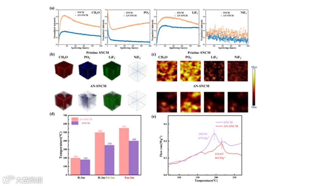 Figure 5. Normalized TOF-SIMS depth maps of SNCM and AN-SNCM cathode CEI after 150 cycles at 3-4.6 V and 1C, respectively. (a) TOF-SIMS depth maps of CH2O−, PO3−, LiF2− and NiF3− species; (b) 3D rendering (CH2O−, PO3−, LiF2− and NiF3−) concentration distribution composition; (c) Chemical imaging of TOF-SIMS on SNCM and AN-SNCM cathode surfaces (CH2O−, PO3−,LiF2− and NiF3−). (d)Phase transition during the In-situ high-temperature XRD patterns, and (e)Differential scanning calorimetry profiles when charged to 4.6V of SNCM and AN-SNCM.