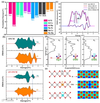 Figure 6. DFT calculation of the effect of doping on the structure and electronic states of the system. (a) Formation energy for replacing Ni, Co, or Mn ions both surface (Sur.) and bulk layer (Bulk) with Al or Nb ions. (b-c) The calculated projected density of states of Ni:3d, O:2p and the total density of states plots of SNCM and AN-SNCM. (d-e) The calculated projected density of states of O 2p and 2D contour maps of charge density distribution.