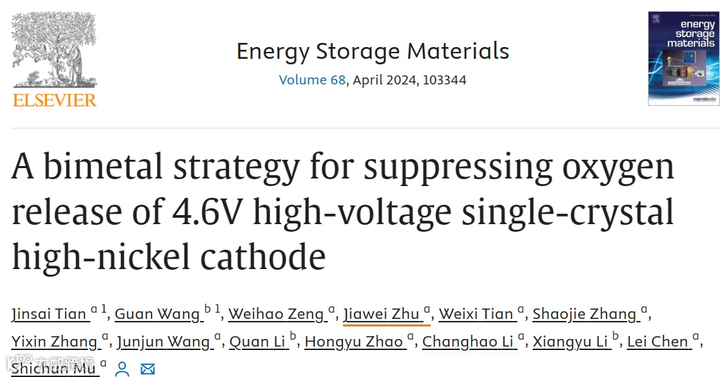 近日,武汉理工大学木士春教授在国际知名期刊Energy Storage Materials上发表题为“A Bimetal Strategy for Suppressing Oxygen Release of 4.6V High-voltage Single-crystal High-nickel Cathode”的观点文章。针对富镍单晶正极材料在高截止工作电压下晶格氧的不可逆释放问题,该观点文章提出了一种利用双金属元素抑制高压条件下富镍正极材料氧气释放的有效策略。经过改性后的正极材料,在3-4.6V的电压窗口内可长时间稳定工作,而且初次循环过程中的氧释放得到有效的抑制。