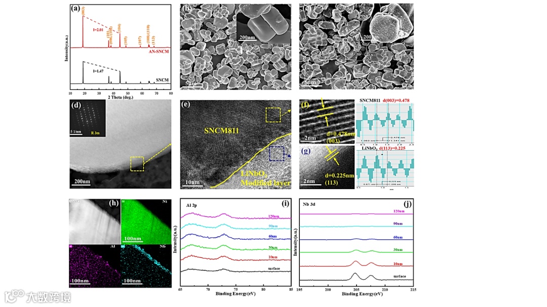 Figure 1. (a) XRD patterns of SNCM and AN-SNCM. (b and c) SEM images of micron-sized SNCM and AN-SNCM particles. (d) HAADF-STEM image and corresponding SEAD patterns of AN-SNCM. (e-g) TEM of AN-SNCM particle surface. (h) HADDF image of AN-SNCM and TEM-EDS element mapping results of Ni, Al, Nb. (i-j) XPS patterns with a different etching time of Al 2p, Nb 3d for AN-SNCM.