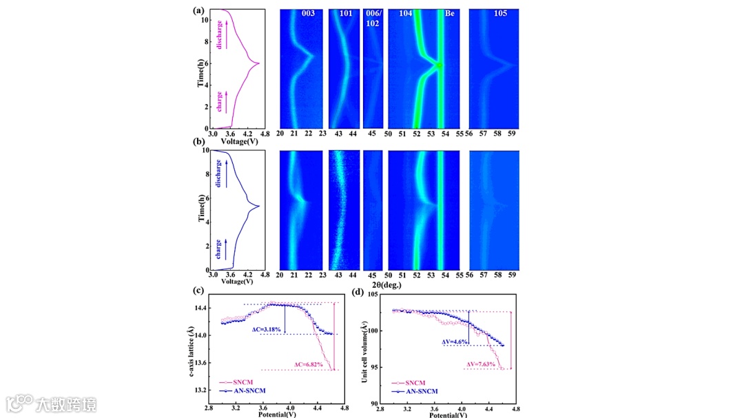 Figure 3. Phase transition during cyclic processes. Operando XRD characterization of the full contour plots and selected line patterns for (a) SNCM and (b) AN-SNCM cathodes during the initial cycle in the voltage range of 3-4.6 V, 0.2C. The variation of the c-axis and cell volume parameter during charging for pristine (c)SNCM and (d)AN-SNCM.