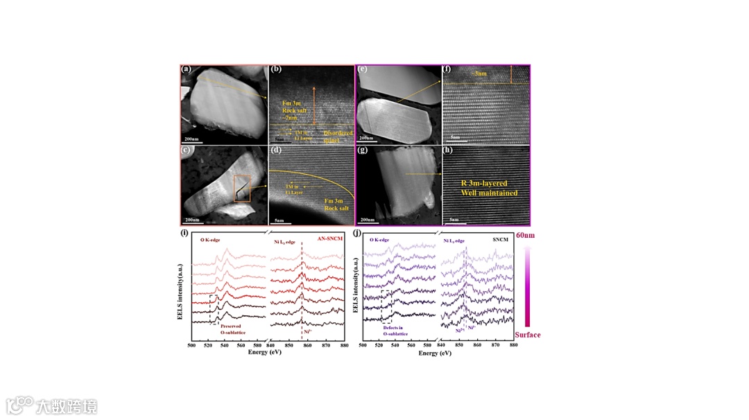Figure 4. (a-h) HAADF-STEM images of SNCM and AN-SNCM particle cross-sections prepared by FIB after 200 cycles at 1C and 4.6V. (i-j) EELS line scanning of Ni and O elements from the surface to the interior of particles.
