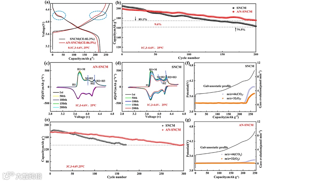 Figure 2. Electrochemical performance of coin type batteries with SNCM and AN-SNCM cathodes in the voltage range of 25 ℃, 3-4.6 V. (a)Initial charge discharge curves of original SNCM and AN-SNCM cathodes. (b) Performance curve for 200 cycles at 1C current density. (c) - (d) dQ/dV spectra of two cathodes derived from Figure 2b. (e) Cycling performance of two cathodes at 3C current density. (f)-(g) Gas evolution profiles of CO2 and O2during the second galvanostatic charge process of SNCM and AN-SNCM electrodes.
