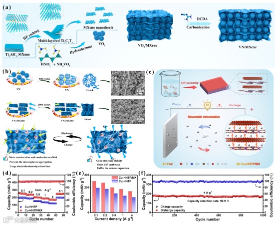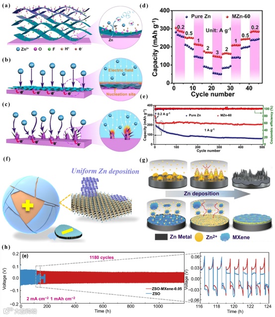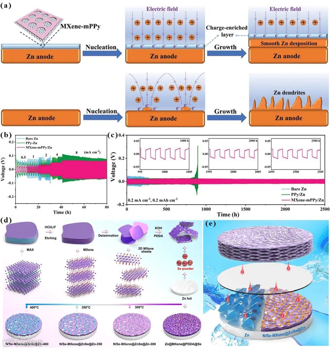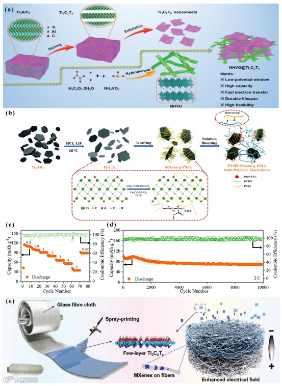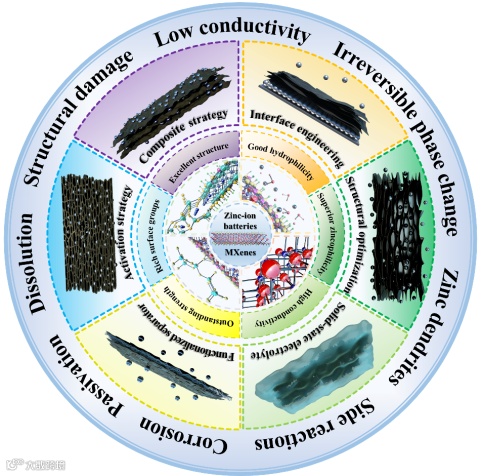近年来,水系锌离子电池(ZIBs)因其安全环保、资源丰富、成本低廉等优点,近年来已成为全球研究的热点。然而,一些重大挑战严重影响了其整体性能,包括阴极的溶解、结构破坏、低导电性和不可逆相变,以及锌阳极的枝晶、副反应、腐蚀和钝化等问题。为了解决这些难题,二维碳化物和氮化物(MXenes)因其独特的物理和化学特性,如高导电性、出色的机械强度、良好的亲水性、丰富的表面基团和可调的结构,已被广泛用于ZIBs的改性。因此,分析和总结MXenes在应对ZIBs挑战的改性策略和作用机理对促进其未来应用和该领域的发展至关重要。