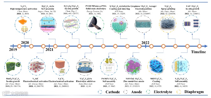 图5. MXenes在ZIBs各组分中改性策略的代表性工作时间表