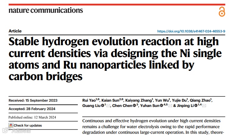 近日,来自太原理工大学的刘光教授,怀柔实验室山西研究院的孙予罕研究员,怀柔实验室山西研究院/太原理工大学的李晋平教授,在国际知名期刊Nature Communications上发表题为“Stable hydrogen evolution reaction at high current densities via designing the Ni single atoms and Ru nanoparticles linked by carbon bridges”的研究文章。该研究文章深入分析了NiSAs与Ru纳米颗粒对OH中间体的协同吸附关系,从而保证了其在大电流密度下仍能高效、稳定产氢,其中碳桥作为媒介实现了Ni和Ru位点之间的物种传输和相互作用。