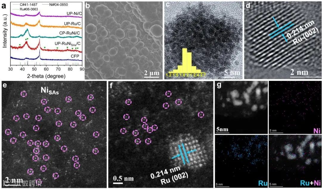 不同于传统的恒电位沉积(CP)技术长时间沉积造成的浓差极化效应,单极脉冲(UPED)方法可以通过脉冲电压有效地削弱浓差极化,将Ni单原子锚定在碳载体上,并有效地与超小Ru纳米颗粒耦合,形成了一种稳定的Ni单原子锚定碳缺陷耦合Ru纳米颗粒结构(UP-RuNiSAs/C)。