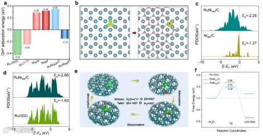 通过DFT计算分别构建了不同尺度的Ni结构模型,包括立方Ni的Ni(111)、锚定在石墨碳取代位点上的Ni单原子(Nisub/C)和锚定在石墨碳边缘(缺陷)位点上的Ni单原子(Nidef/C),以研究它们对Ru纳米晶吸附能的影响。最终确定,Nidef/C在调节Ru纳米晶OH*吸附能方面效果最佳,从而使得在 RuNidef/C中Ru (002)活性位点上获得最佳的OH*吸附能(EOH*=-0.15 eV)。此外,部分态密度 (PDOS)证明,当Nidef引入Ru (002)体系时,d带中心从-1.63 eV下移到-2.86 eV,Ru对OH*的吸附减弱。Ru和Ni之间的电子相互作用削弱了RuNidef/C对OH*的吸附,从而降低了最终的水分解能垒。RuNidef/C的水分解能垒从Ru (002)的0.52 eV下降到0.39 eV,表明Nidef/C是调节中间产物吸附能和加速活性Ru上水解离的最佳选择。因此,理论预测Ru和Nidef/C催化位点可促进OH*的协同吸附,其中缺陷碳作为链接可促进Ru和 Ni 位点之间的协同水解离以及中间产物的解吸,从而促进其大电流碱性HER活性。
