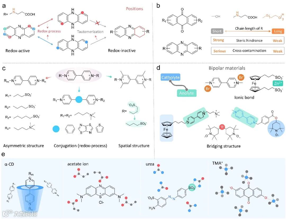图6 (a) 提出了1,6-AFPs和2,7-AFPs的互变异构路径。(b) 烷基链长度及电荷大小的影响。(c) 用于增强溶解度的具有不同结构的吡啶类衍生物,同时促进双电子转移过程,并减弱交叉现象。(d) 通过离子键或共价桥接结构连接的双极性氧化还原活性材料。(e) 用于增强溶解度和稳定性的溶剂化效应。